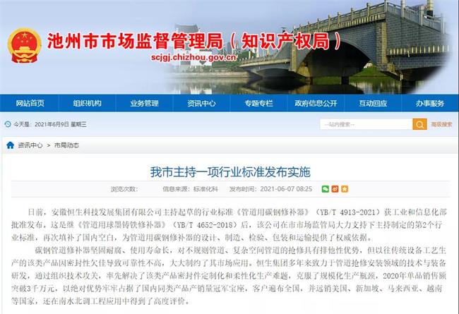 恒生集團多年來致力于管道搶修安裝領(lǐng)域的技術(shù)與裝備研發(fā),并已發(fā)展成為集微電子、機械、化工及彈性體密封件制造等為一體,擁有多家控股子公司的多元化、現(xiàn)代化企業(yè)。恒生集團是“安徽省高新技術(shù)企業(yè)”和“國家知識產(chǎn)權(quán)優(yōu)勢企業(yè)”,是多種材料標準的主要起草單位,2015年國家工信部批準了由恒生集團主持起草《管道用球墨鑄鐵修補器》的國家行業(yè)標準,該標準將于2018年9月開始實施,這對引導(dǎo)國內(nèi)管道修補器行業(yè)的發(fā)展有著積極而深遠的意義。